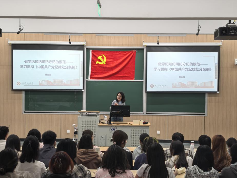 授课过程中,韩云霄首先梳理了《条例》的发展演进脉络,详细介绍了其制定与完善的时代背景,剖析《条例》制定的初衷与历次修订的深层原因,帮助学员从历史和全局高度理解《条例》出台与完善的深远意义。随后,她聚焦《条例》核心内容,讲解其总分则的整体框架,围绕政治纪律、组织纪律、廉洁纪律、群众纪律、工作纪律、生活纪律六大纪律的修订要点逐一细致解读,着重强调“纪严于法”“纪法衔接”的鲜明导向,让学员深刻把握党纪严于国法的内在要求。课程最后,韩云霄明确,学习《条例》的目的在于厘清纪律边界,将纪律规矩转化为政治自觉、思想自觉、行动自觉,同时勉励全体学员坚持全面学、系统学、深入学,切实把《条例》各项规定学深悟透,自觉将纪律规矩内化于心、外化于行。