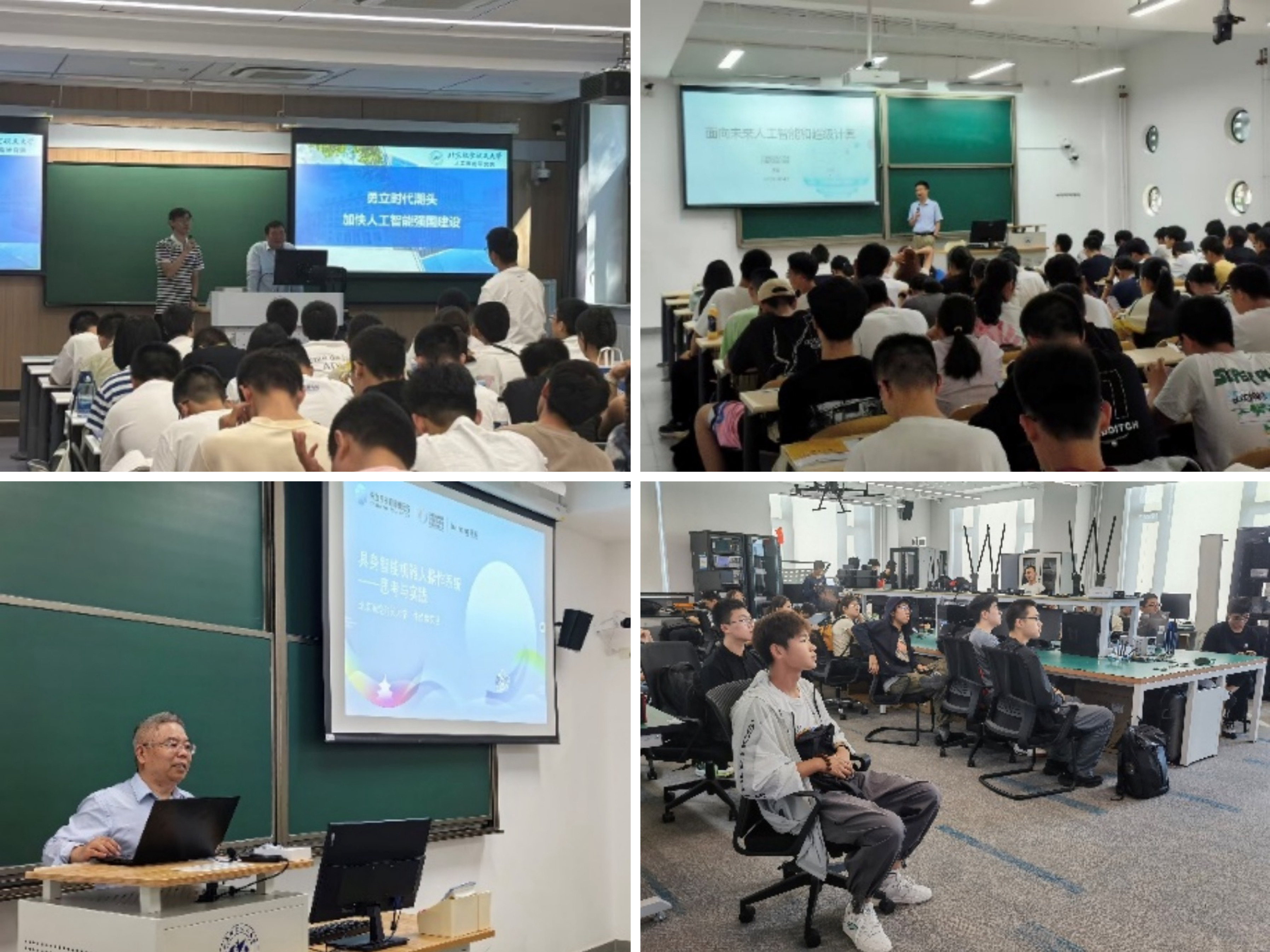 计算与智能科学类各专业学院带领同学们深入学院重点实验室,近距离接触行业前沿技术与科研成果。计算机学院李波老师为同学们作《面向未来人工智能和超级计算》主题讲座,深入探讨了AI的局限性,同时强调了计算机学科与其他领域的跨学科合作潜力,并指出计算机学科与多学科交叉的重要性,展示了其在推动科技进步中的关键作用。软件学院副院长谭火彬老师介绍学院概况与培养方案,牛建伟、盛律、于茜、张晶四位老师分别分享了具身智能与机器人融合、大小脑协同模型、大模型赋能矢量图与草图理解、多模态大模型驱动Web UI Agent等前沿技术。网络空间安全学院高年级学生带领一年级新生参观各类实验室,沉浸式体验网络空间对抗与舆情管控的实战场景,近距离感受AI社交机器人账号的存在与舆情引导原理。人工智能学院(人工智能研究院)吴文峻老师以图灵测试等案例阐释了AI的概念与能力并回顾发展历程,强调了需求、算法、算力协同的重要性,重点介绍学院五大方向以及取得的重大成果,并向同学们介绍了学院以基础理论为核心、结合多领域技术与应用的育人体系。