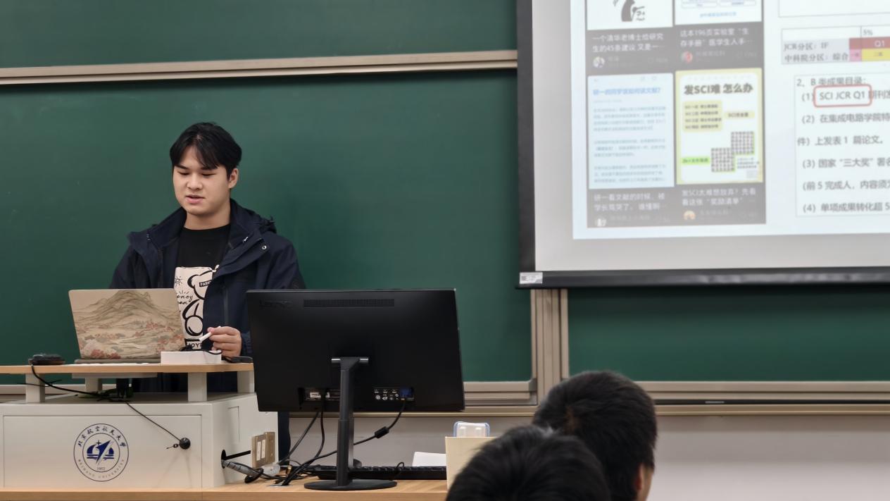 活动中,书院辅导员熊号堃以 “科创赛事全流程解析” 为主题,系统梳理了各类学科竞赛、科研创新项目的申报要求、研究方向与实施路径,帮助学生构建起 “认知 - 准备 - 参赛” 的完整逻辑体系。结合北航学子在国家级、校级科创赛事中的获奖案例,他还针对性分享了文献检索、团队协作、项目答辩等科研基础知识,同时给出分阶段参赛时间规划建议,为同学们科学备赛提供实操性指导。