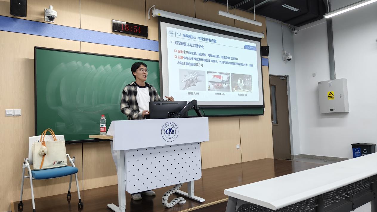 航空专场由航空学院本科2024级辅导员、2025级硕士研究生于昔正主讲。他从航空学院的学科布局出发,介绍了各专业的课程体系、培养要求与实践特色,并通过案例帮助新生建立初步学科认识。随后,他就学习方法、学习适应等内容分享经验,鼓励学生在夯实基础的同时积极参与实践活动,提升综合能力。