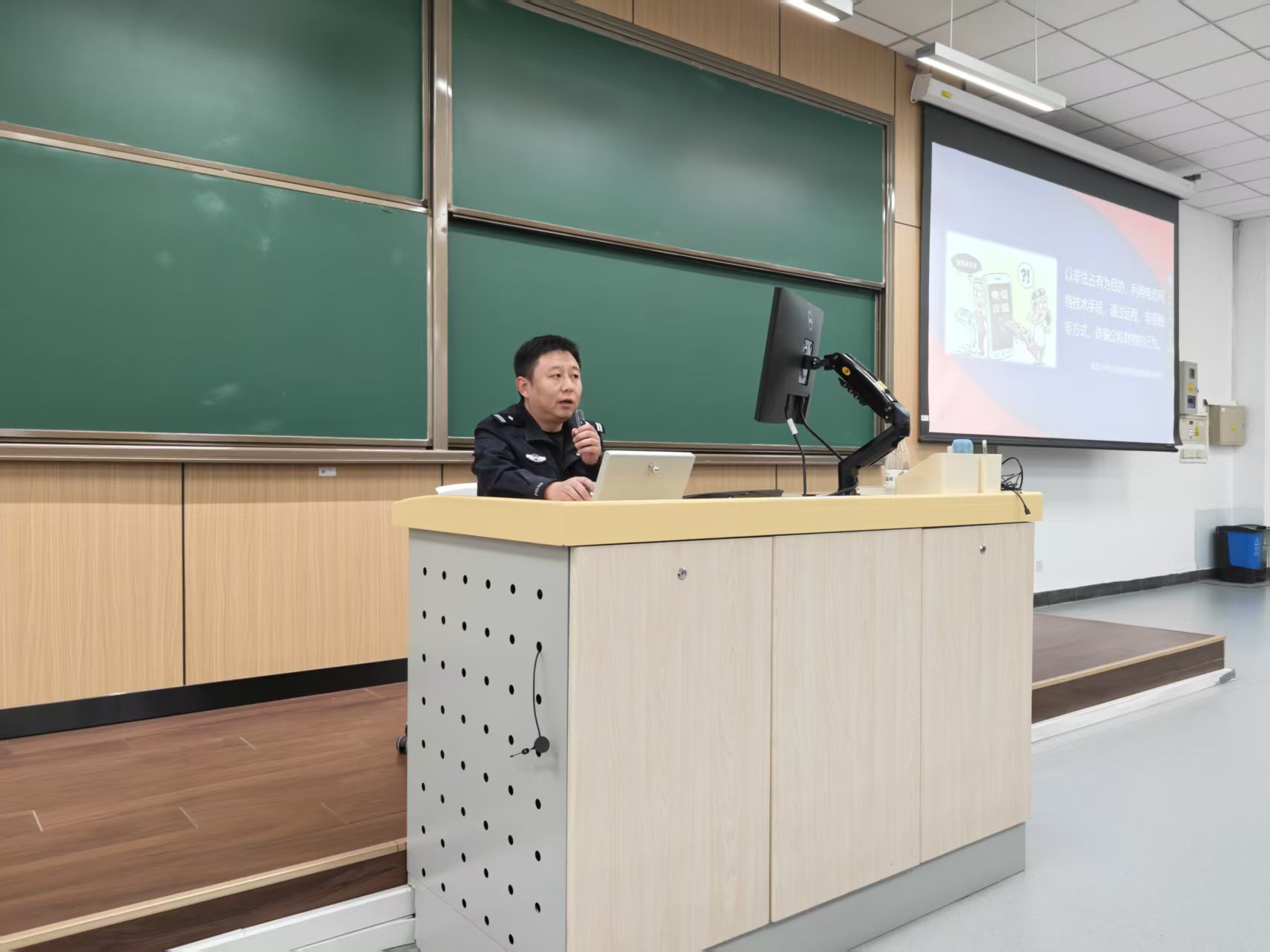 李博洋副所长结合一线办案经验,从当前电信网络诈骗的整体态势切入,帮助学生建立宏观认知。讲座围绕四个维度展开深度剖析:一是网络犯罪已成主流,诈骗手法紧跟社会热点,反诈形势依然严峻;二是诈骗手段加速迭代,刷单返利、虚假投资理财等五类案件尤为高发;三是攻防对抗持续升级,虚假APP诈骗占比高达60%,且大量利用境外通讯渠道实施;四是跨国作案特征日趋明显,境内外衔接紧密,打击治理难度加大。